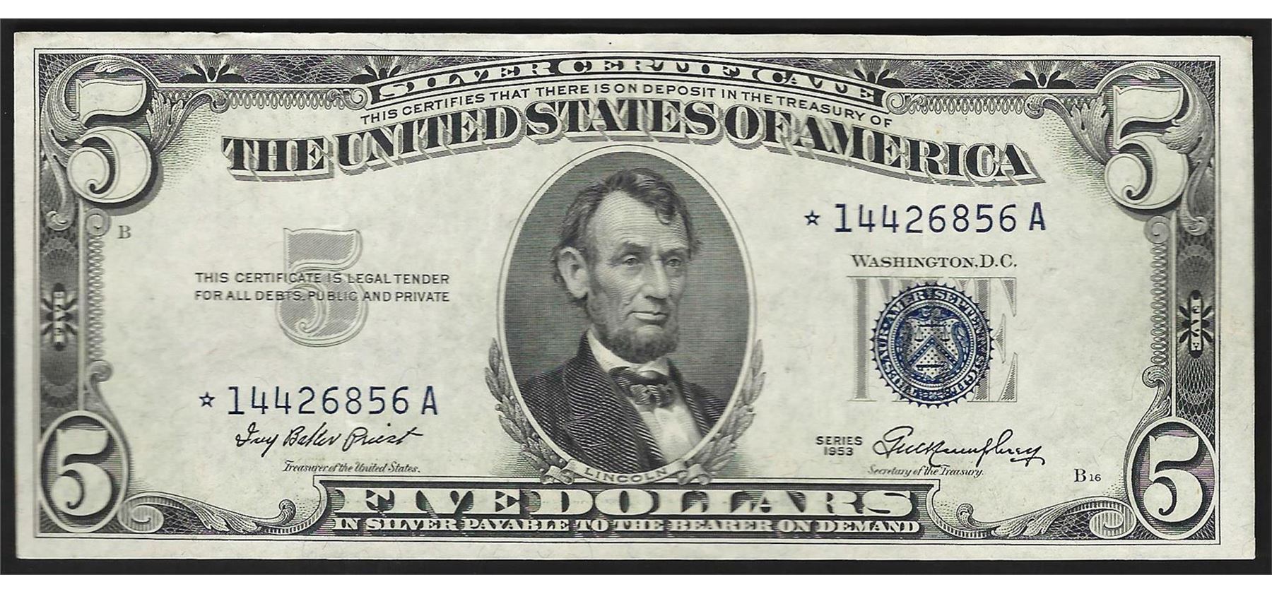 One 1953 $5 Silver Certificate STAR Note.