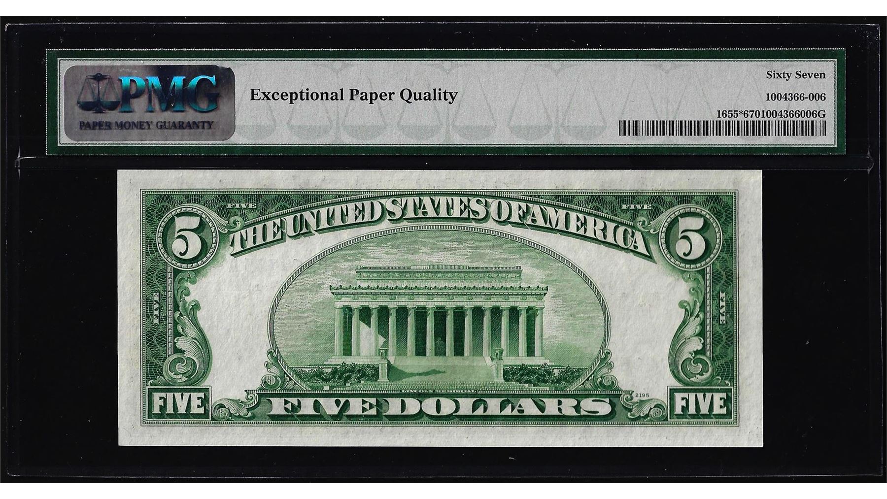 One 1953 $5 Silver Certificate Star Note Fr.1655* PMG Superb Gem Uncirculated 67EPQ. PMG Certified.