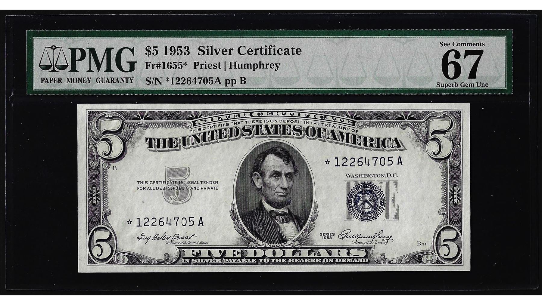 One 1953 $5 Silver Certificate Star Note Fr.1655* PMG Superb Gem Uncirculated 67EPQ. PMG Certified.