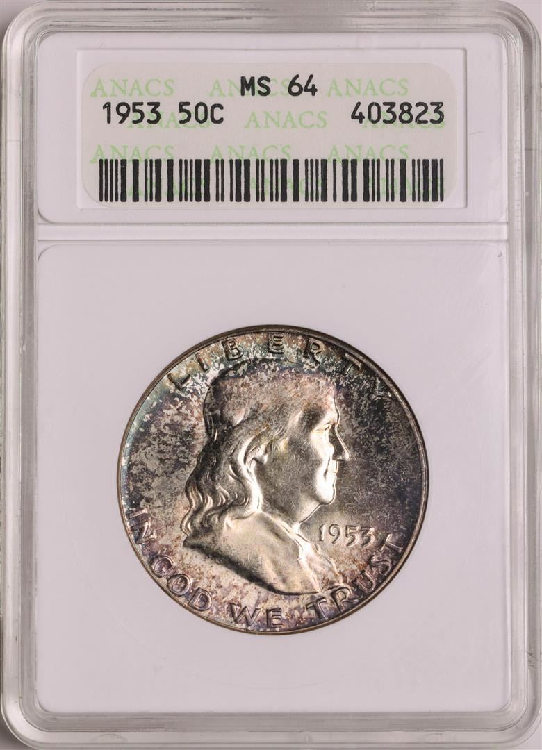 One 1953 Franklin Half Dollar Coin ANACS MS64 Nice Toning. ANACS Certified.