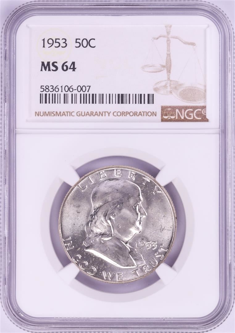 One 1953 Franklin Half Dollar Coin NGC MS64. NGC Certified.