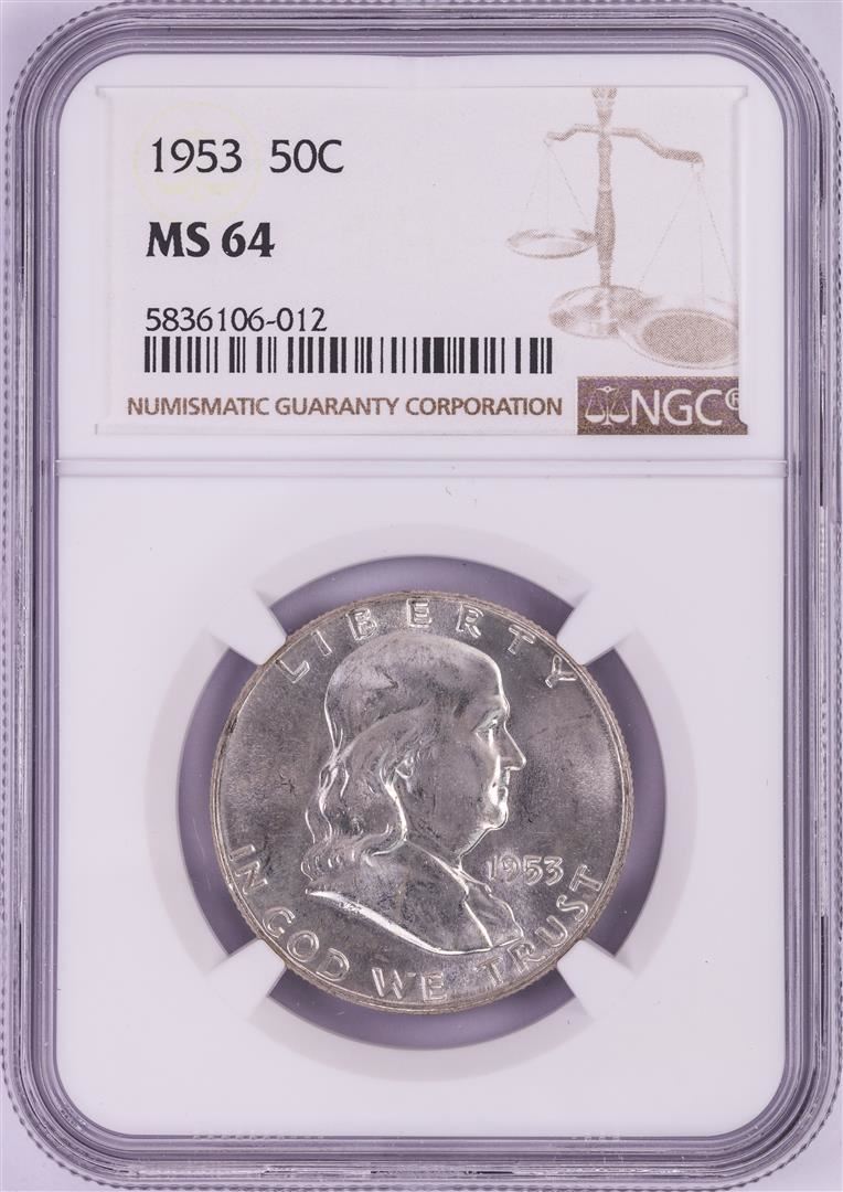 One 1953 Franklin Half Dollar Coin NGC MS64. NGC Certified.