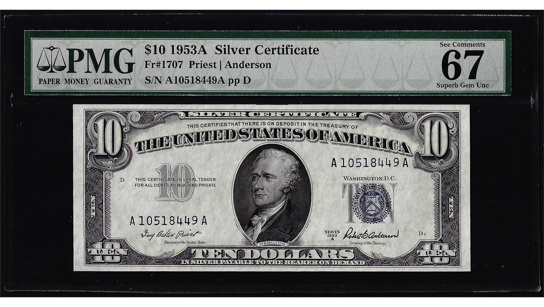 One 1953A $10 Silver Certificate Note Fr.1707 PMG Superb Gem Uncirculated 67EPQ. PMG Certified.