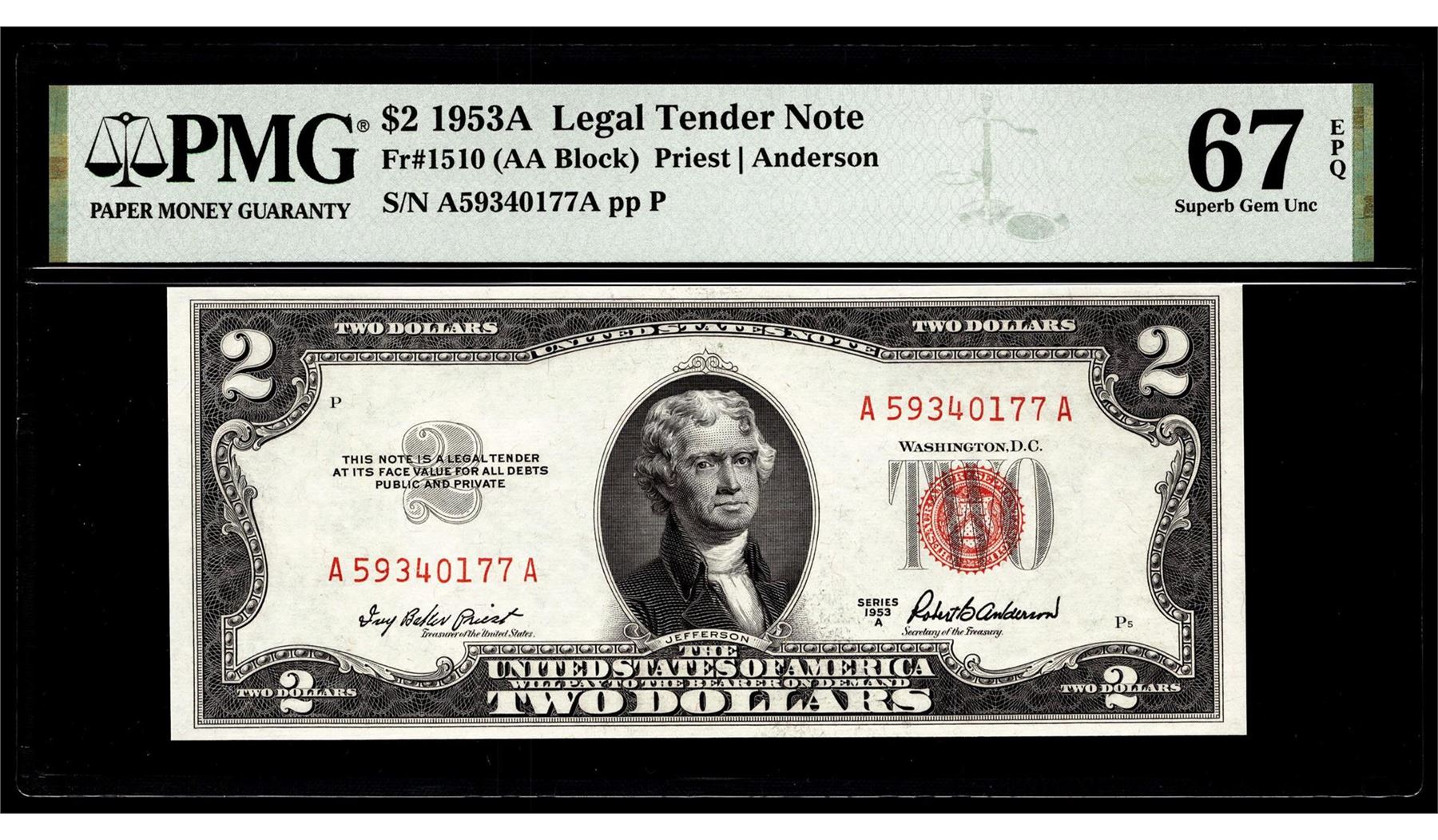 One 1953A $2 Legal Tender Note Fr.1510 PMG Superb Gem Uncirculated 67EPQ. PMG Certified.