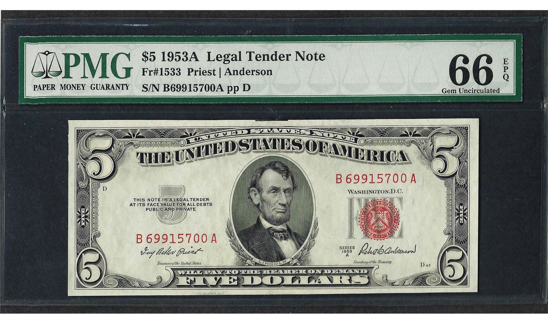 One 1953A $5 Legal Tender Note Fr.1533 PMG Gem Uncirculated 66EPQ. PMG Certified.