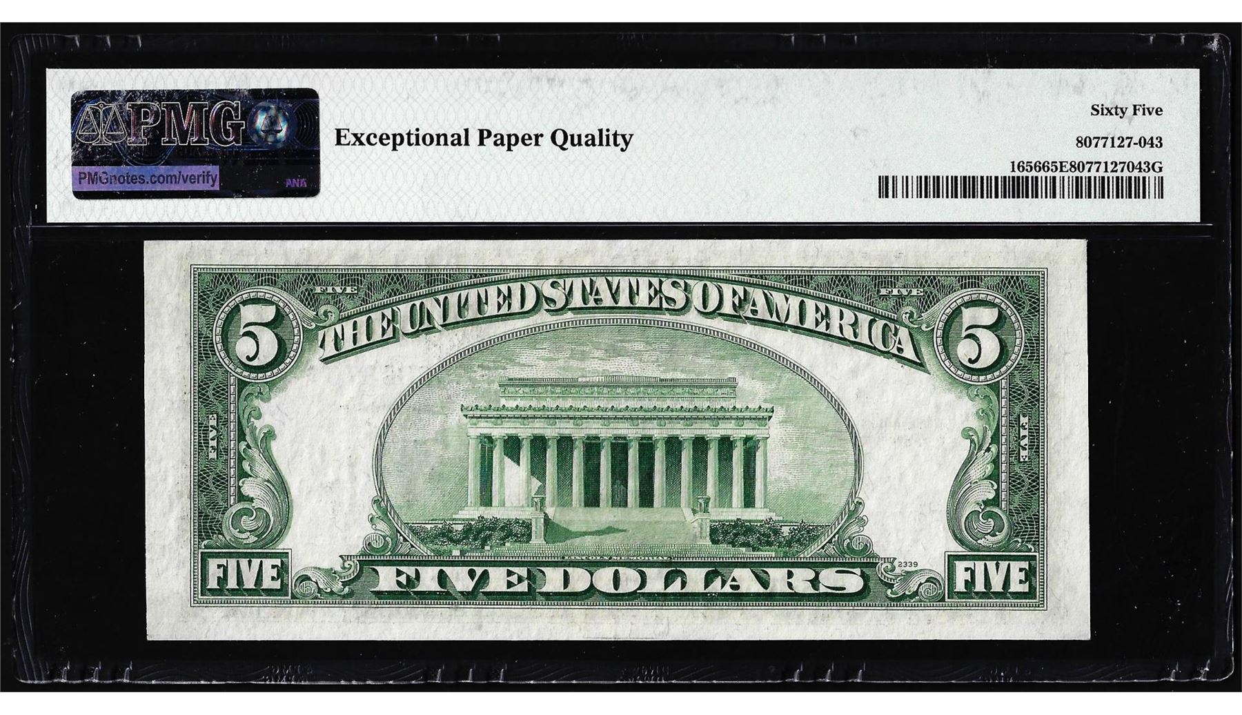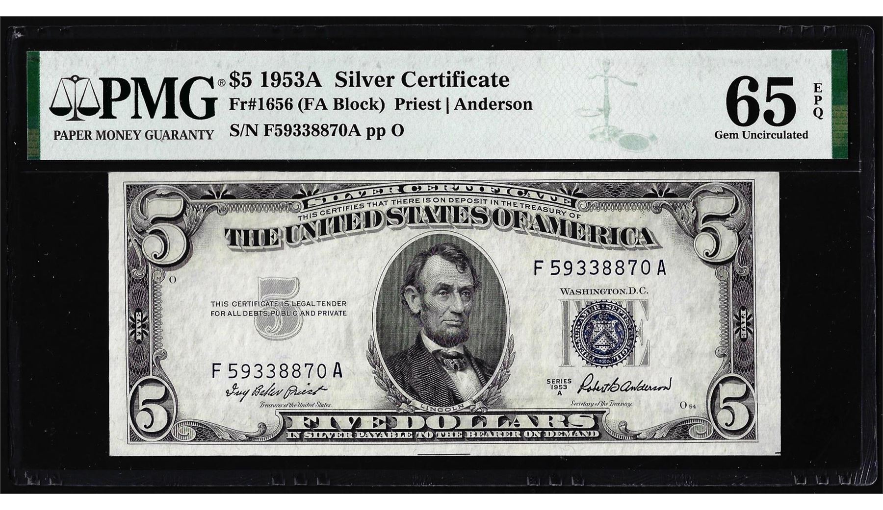 One 1953A $5 Silver Certificate Note Fr.1656 PMG Gem Uncirculated 65EPQ. PMG Certified.