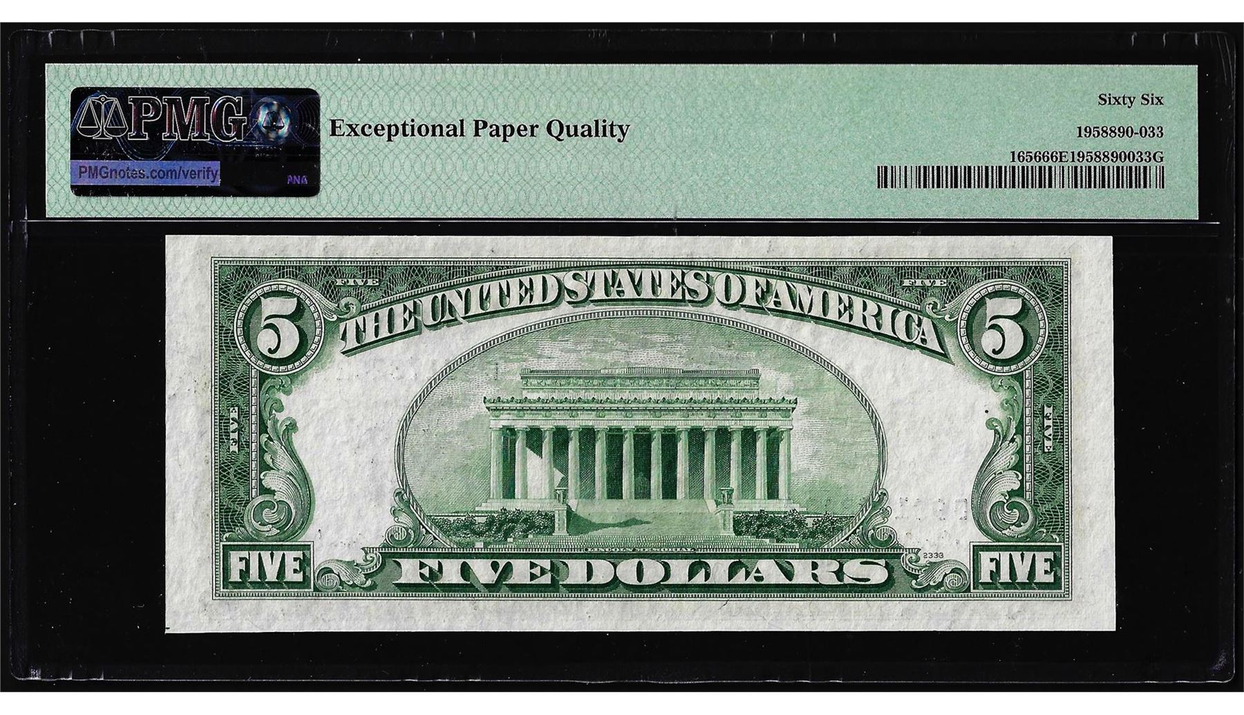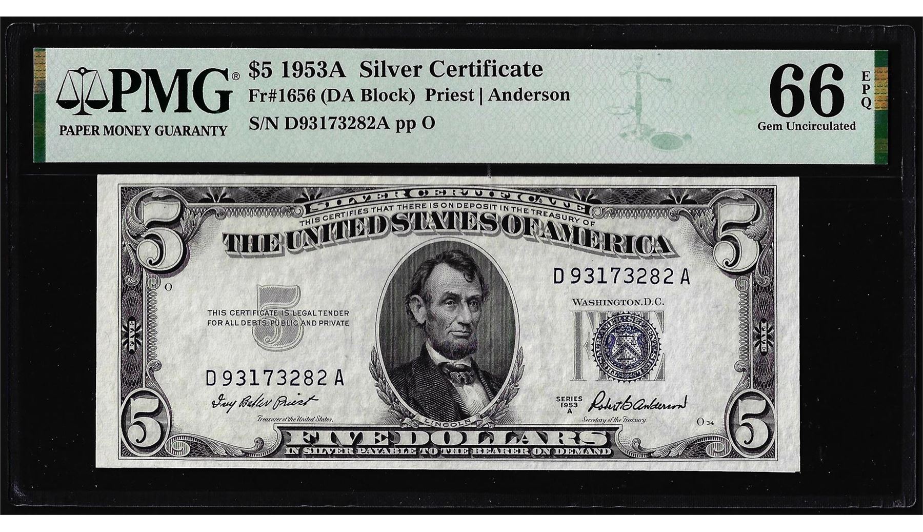 One 1953A $5 Silver Certificate Note Fr.1656 PMG Gem Uncirculated 66EPQ. PMG Certified.