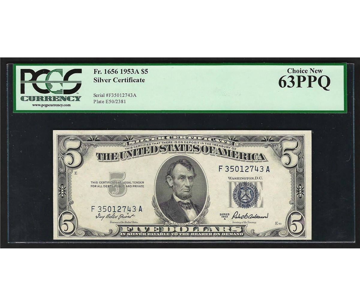 One 1953A $5 Silver Certificate Note PCGS Very Choice New 63PPQ. PCGS Graded.
