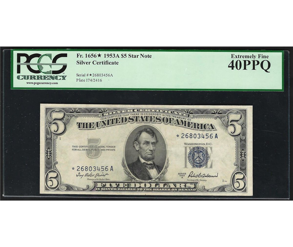 One 1953A $5 Silver Certificate STAR Note PCGS Extremely Fine 40PPQ. PCGS Graded.