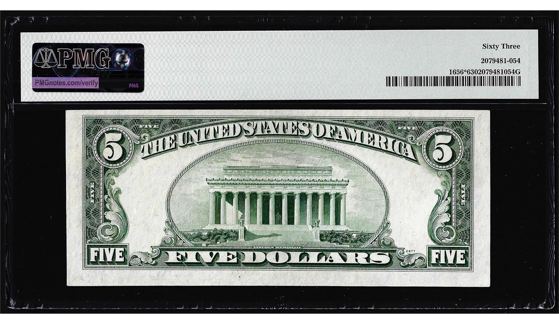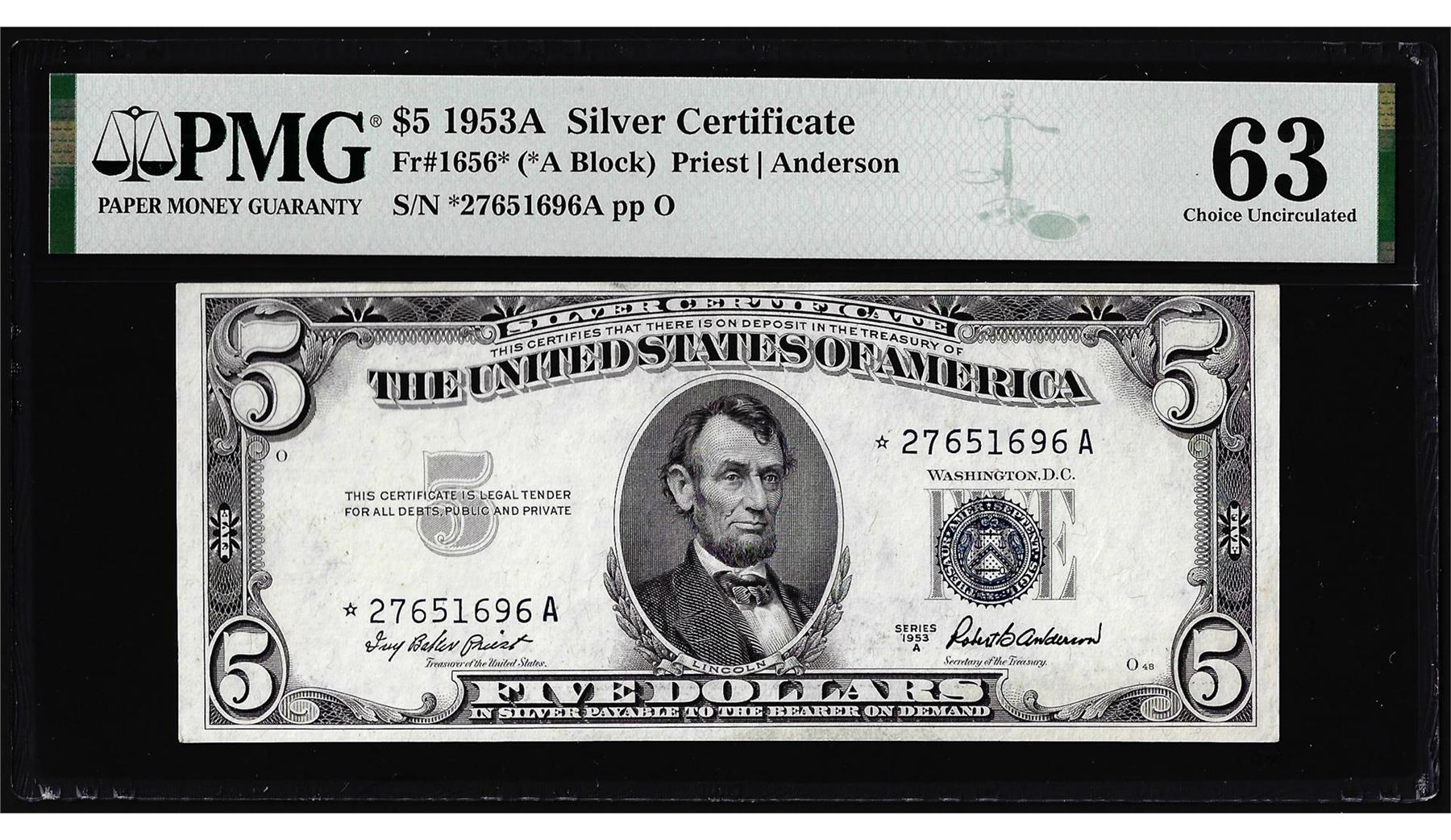 One 1953A $5 Silver Certificate Star Note Fr.1656* PMG Choice Uncirculated 63. PMG Certified.
