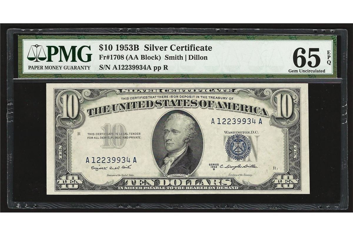 One 1953B $10 Silver Certificate Note PMG 65EPQ. PMG Certified.