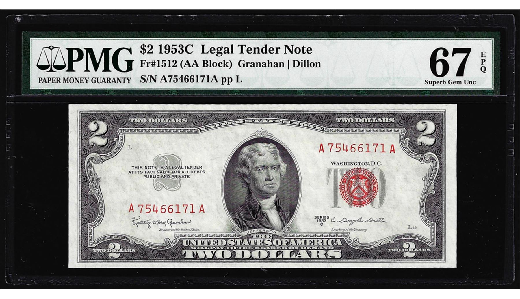 One 1953C $2 Legal Tender Note Fr.1512 PMG Superb Gem Uncirculated 67EPQ. PMG Certified.
