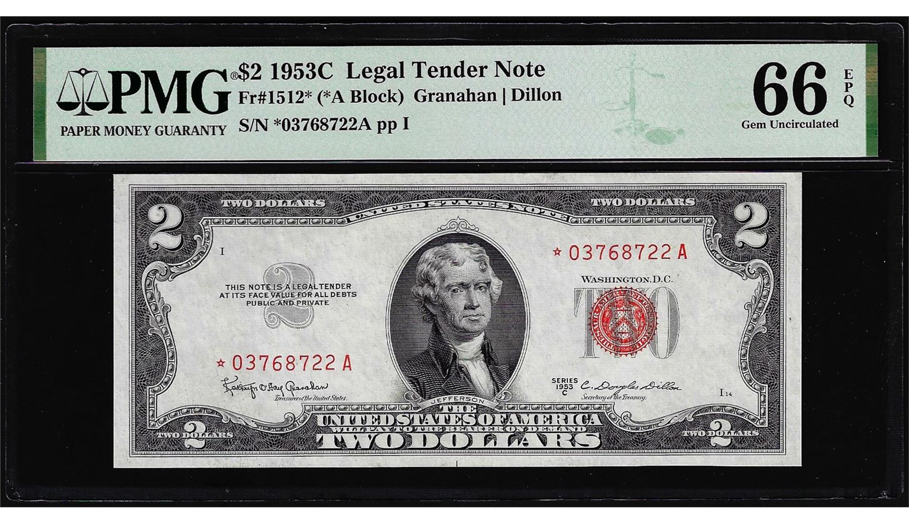 One 1953C $2 Legal Tender Star Note Fr.1512* PMG Gem Uncirculated 66EPQ. PMG Certified.