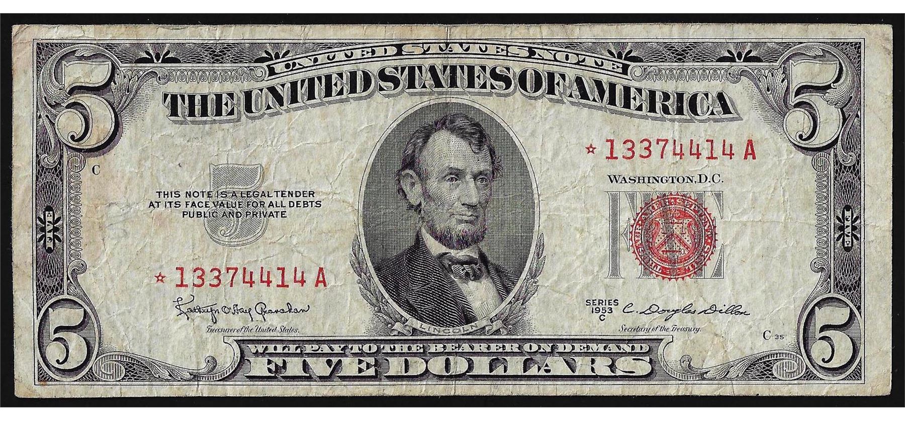 One 1953C $5 Legal Tender Red Seal STAR Note.