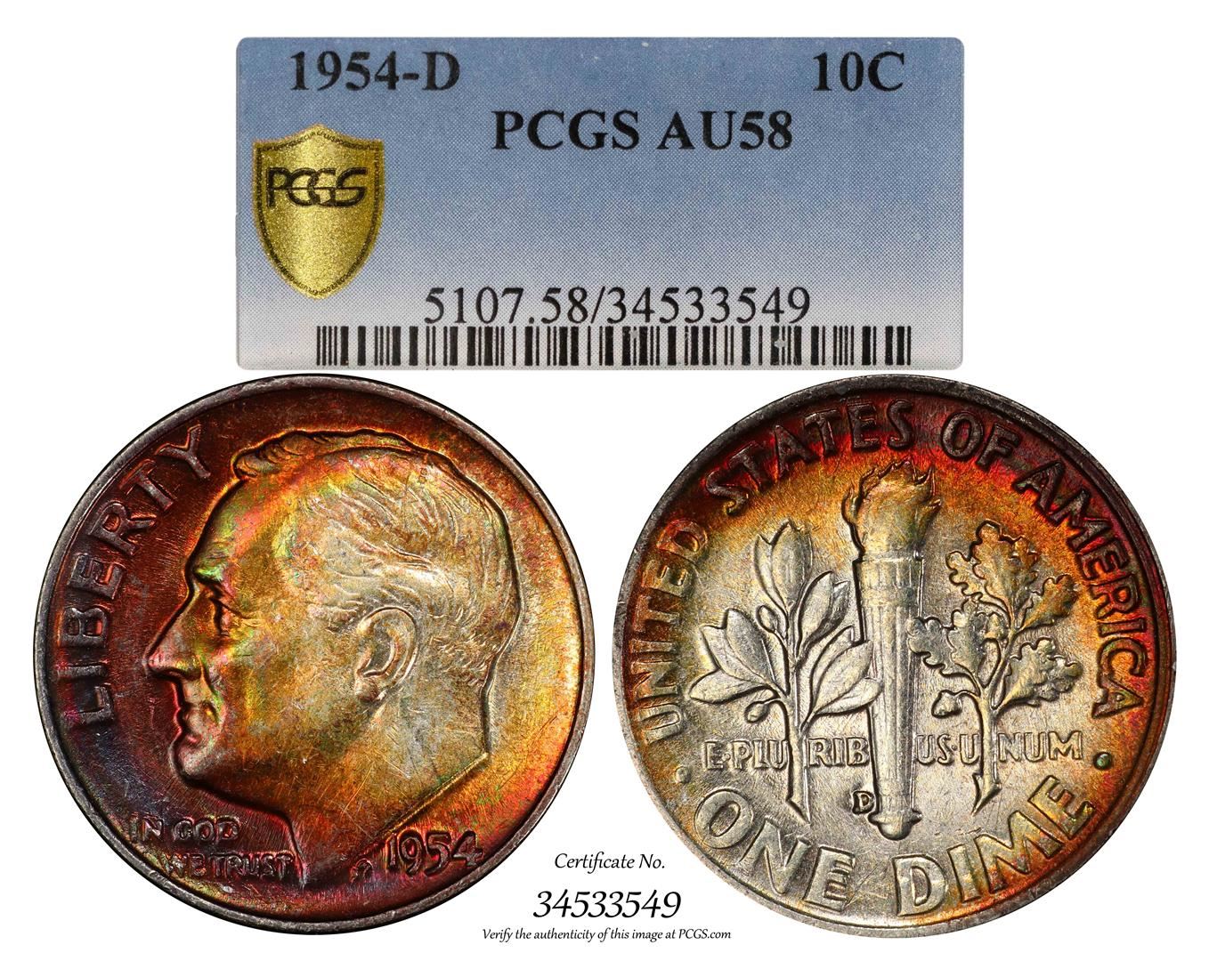 One 1954-D Roosevelt Dime Coin PCGS AU58 Amazing Toning. PCGS Graded.