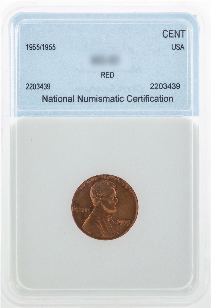 One 1955 Double Die Lincoln Wheat Cent Coin. This coin has been graded by "National Numismatic Certification" company. However, since it is not one of the main numismatic certification companies that we currently recognize, we purposely blurred out the assigned grade of the coin to avoid any confusion. We encourage each bidder to make their own determination as to the grade & value of the coin.