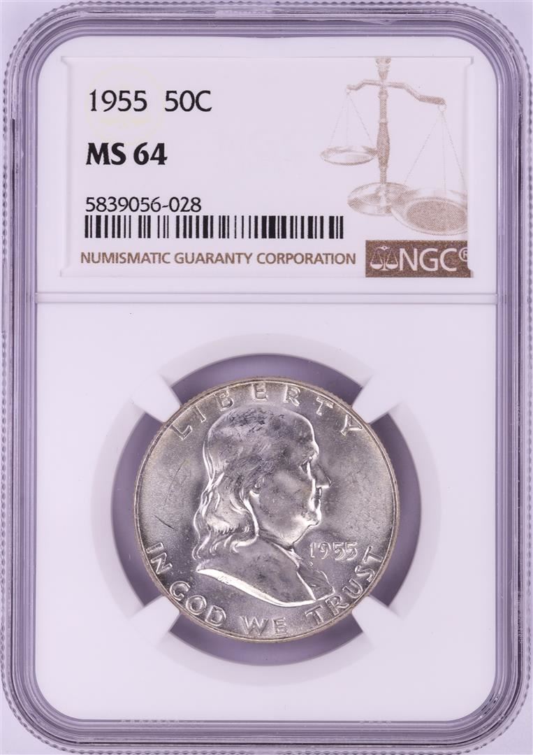 One 1955 Franklin Half Dollar Coin NGC MS64. NGC Certified.