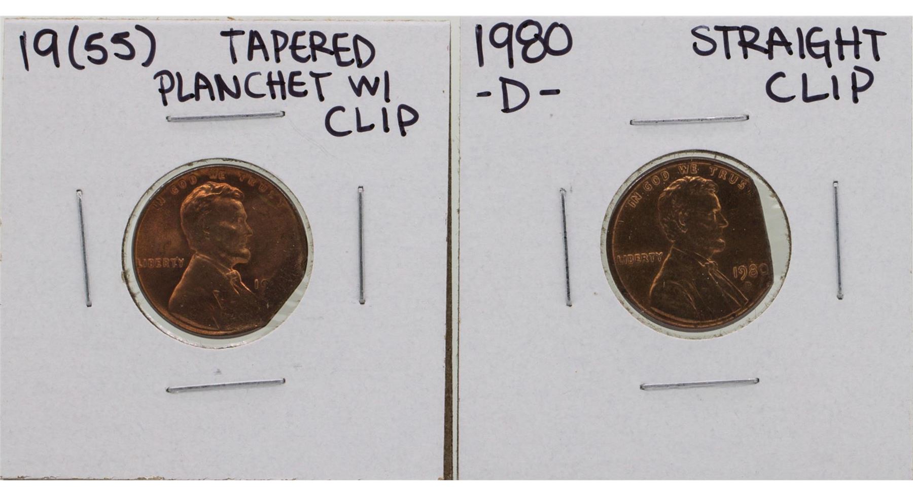 1955 Tapered Clip Planchet & 1980-D Straight Clip Lincoln Wheat Penny ERROR Coin