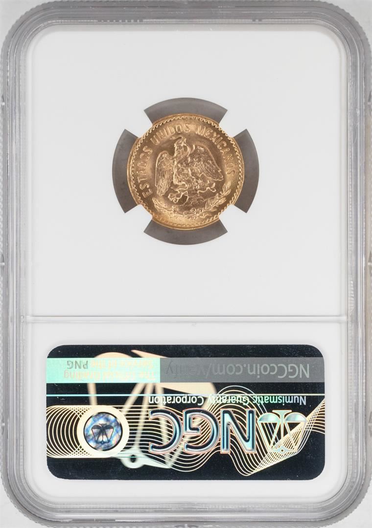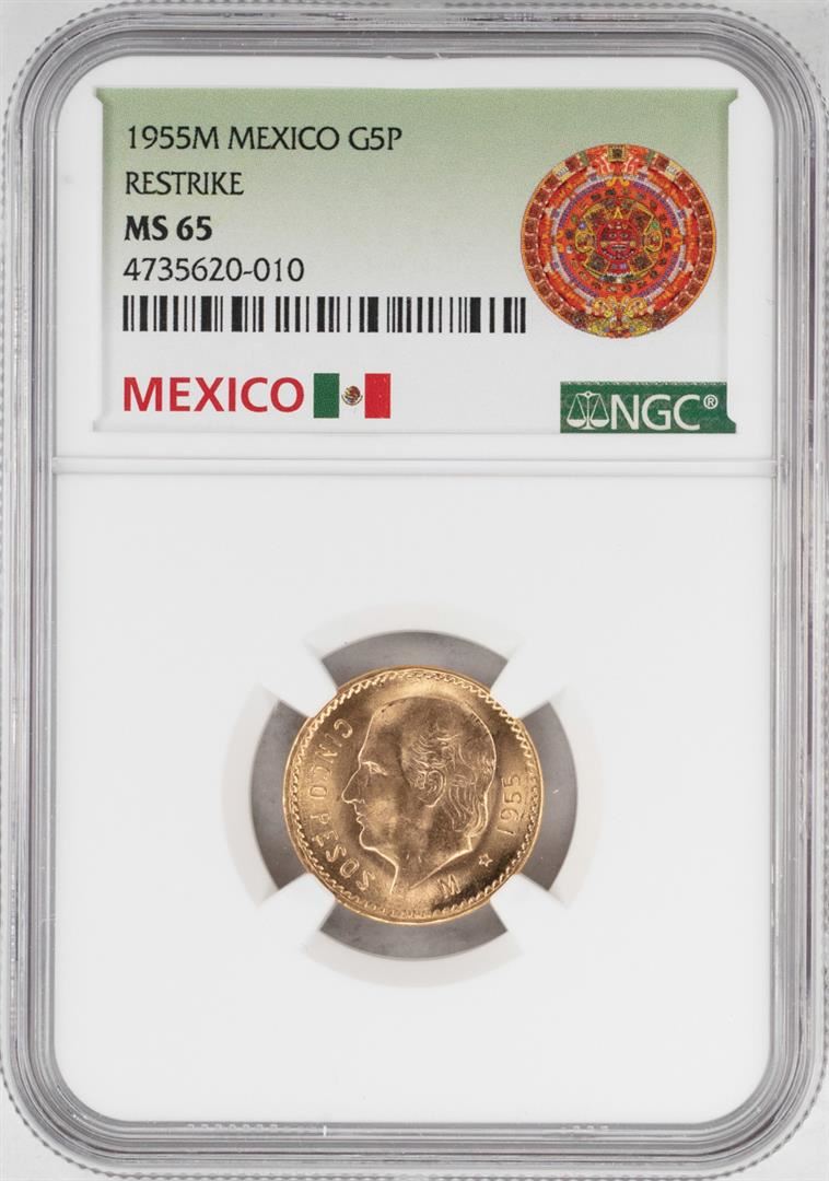 One 1955M Mexico 5 Pesos Gold Coin NGC MS65. NGC Certified.