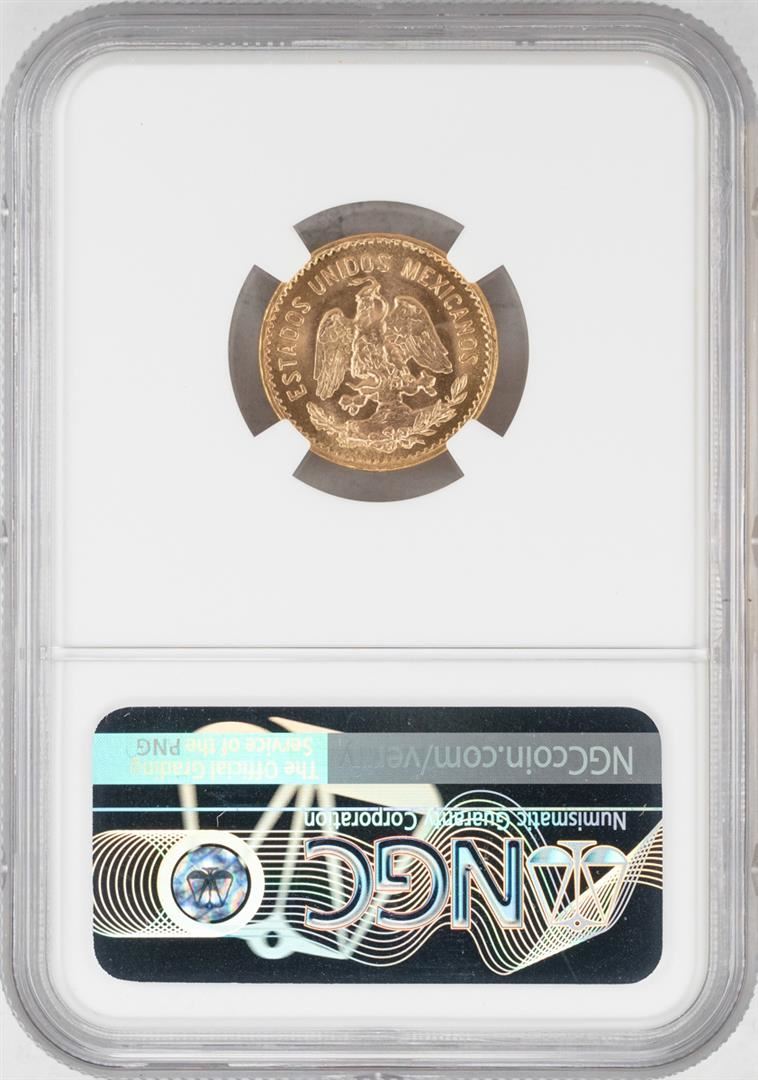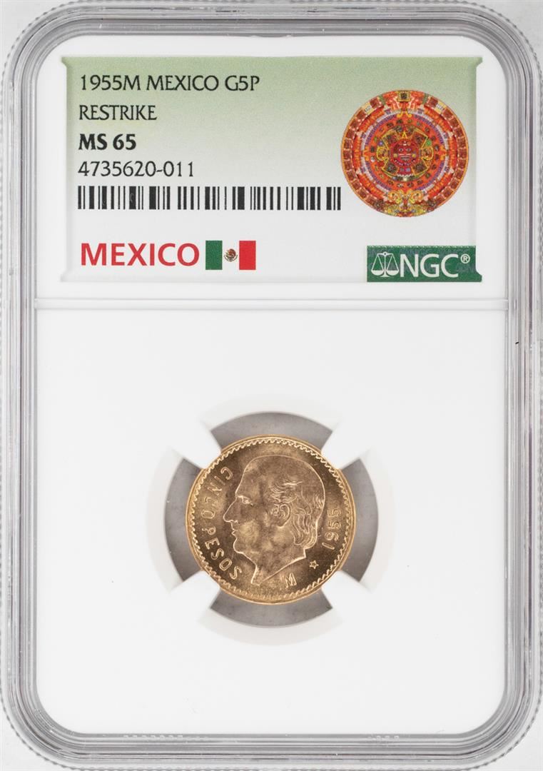 One 1955M Mexico 5 Pesos Gold Coin NGC MS65. NGC Certified.