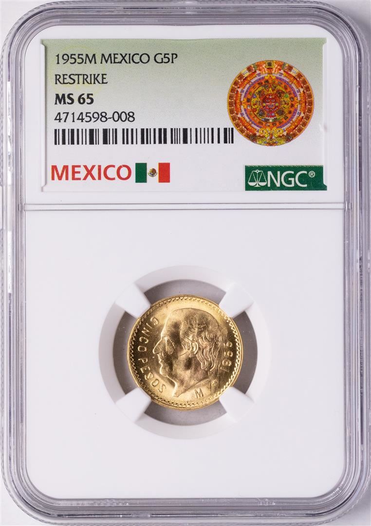 One 1955M Mexico 5 Pesos Restrike Gold Coin NGC MS65. NGC Certified.