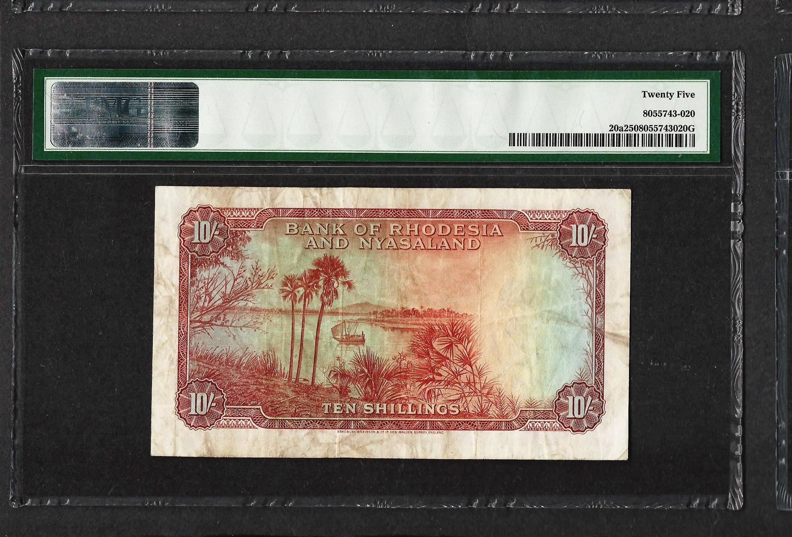 One 1956-60 British Admin. Rhodesia & Nyasaland 10 Shillings Note PMG Very Fine 25. PMG Certified.