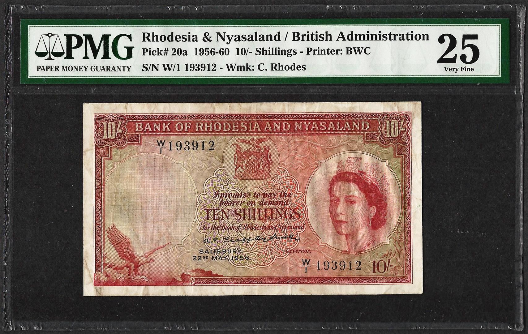 One 1956-60 British Admin. Rhodesia & Nyasaland 10 Shillings Note PMG Very Fine 25. PMG Certified.