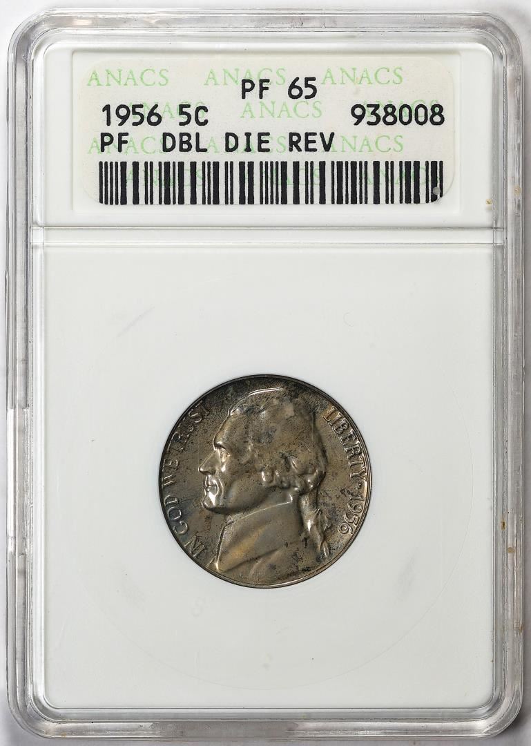 One 1956 Double Die Reverse Proof Jefferson Nickel Coin ANACS PF65 Soapbox Holder. ANACS Certified.