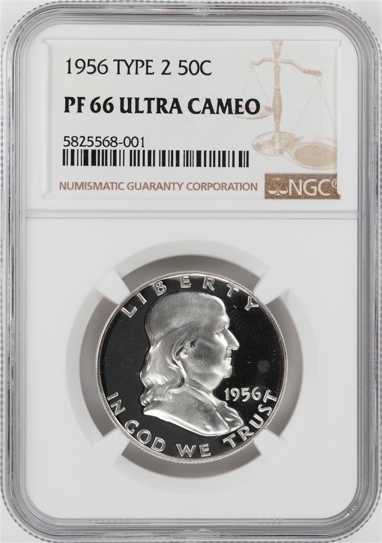 One 1956 Proof Franklin Half Dollar Coin NGC PF66 Type 2 Ultra Cameo. NGC Certified.