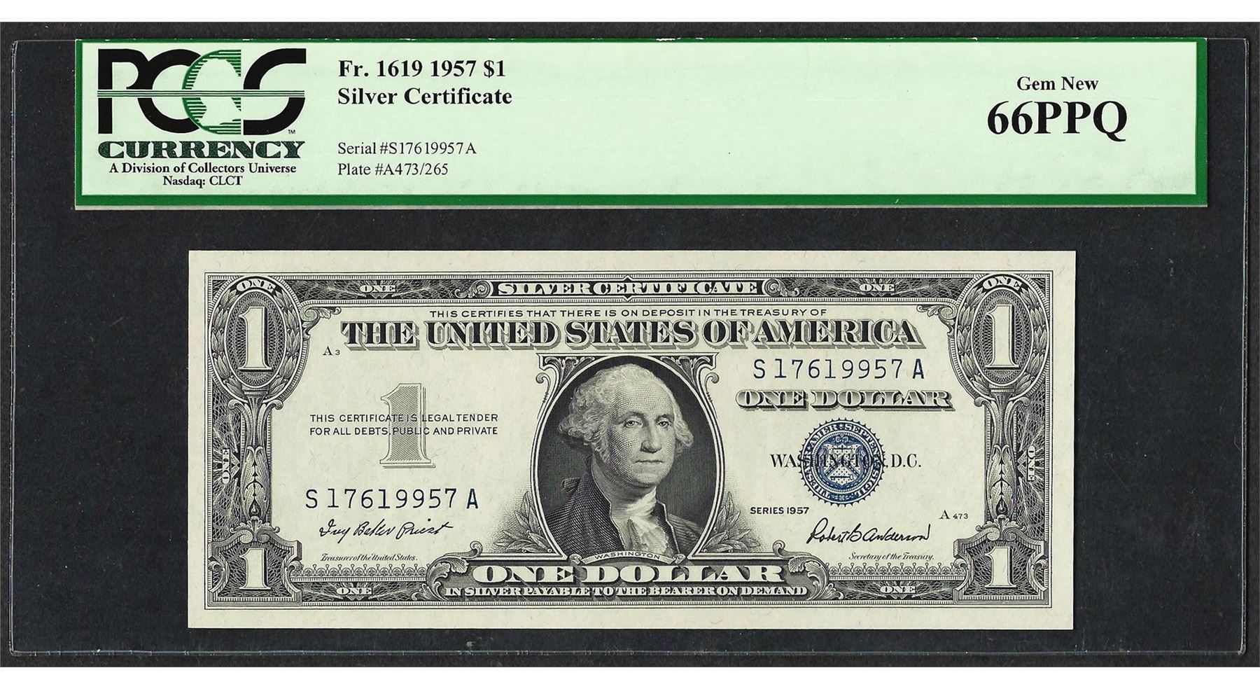 One 1957 $1 Silver Certificate Note Fr.1619 PCGS Gem New 66PPQ. PCGS Graded.
