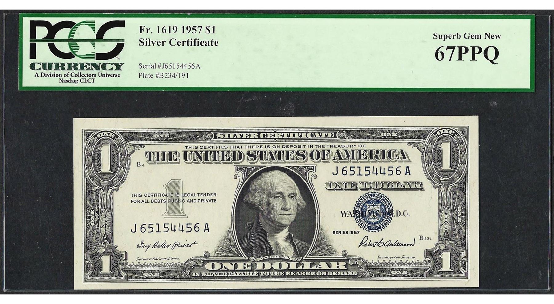 One 1957 $1 Silver Certificate Note Fr.1619 PCGS Superb Gem New 67PPQ. PCGS Graded.