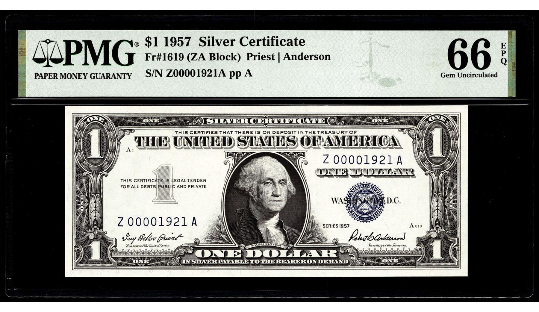 1957 $1 Silver Certificate Note Fr.1619 PMG Superb Gem Uncirculated 66EPQ Low Serial