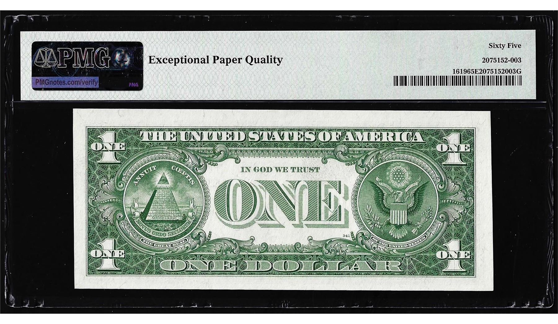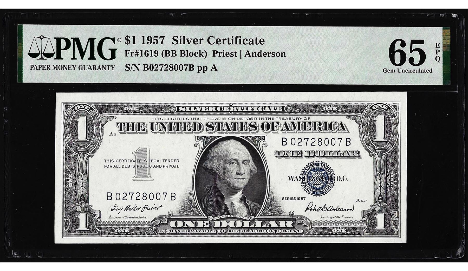 One 1957 $1 Silver Certificate Note KEY BB Block Fr.1619 PMG Gem Uncirculated 65EPQ. PMG Certified.