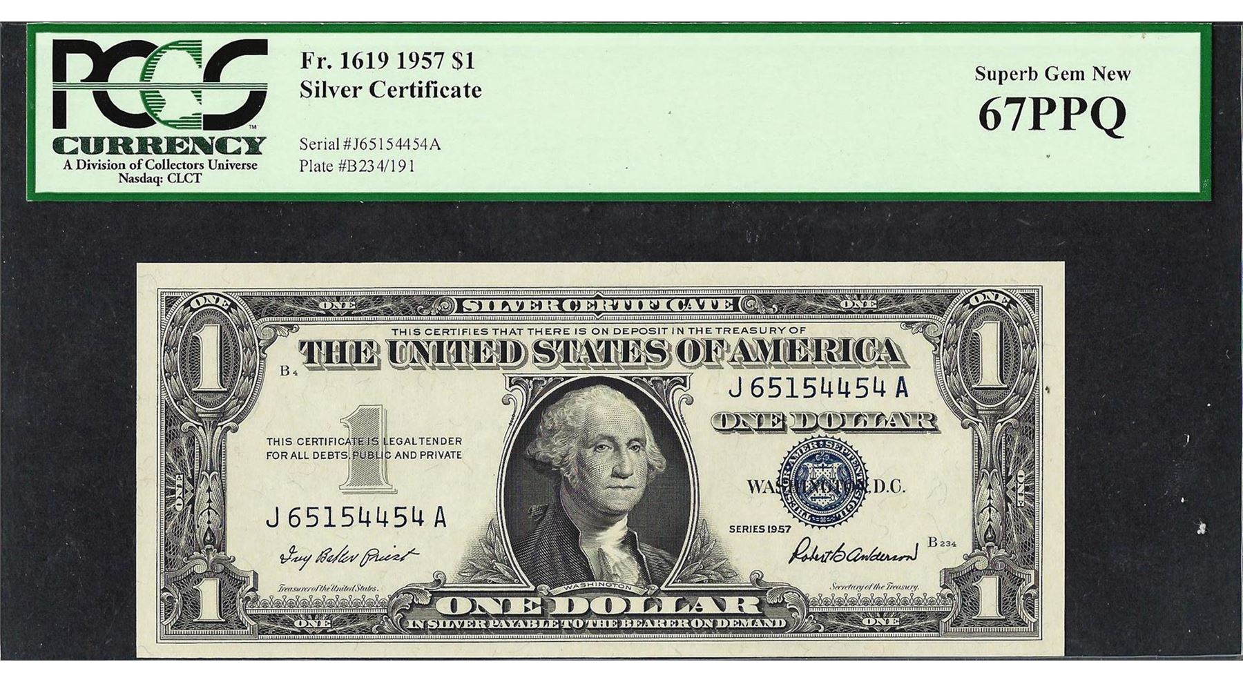 One 1957 $1 Silver Certificate Note PCGS Superb Gem New 67PPQ. PCGS Graded.