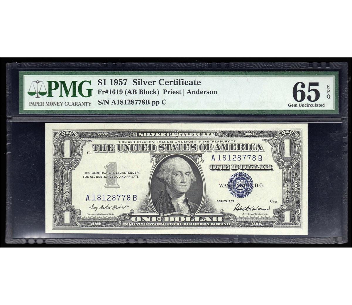 One 1957 $1 Silver Certificate Note PMG 65EPQ Gem Uncirculated. PMG Certified.