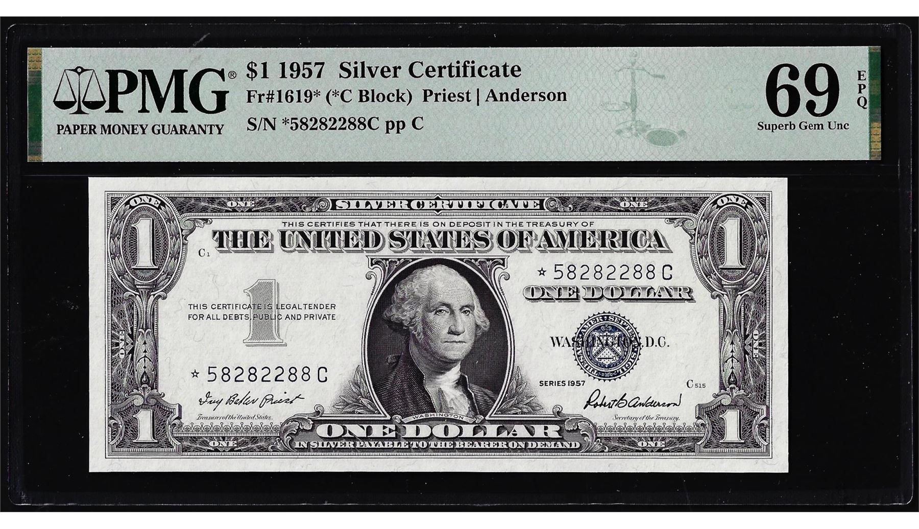 One 1957 $1 Silver Certificate Star Note FR.1619* PMG Superb Gem Uncirculated 69EPQ. PMG Certified.