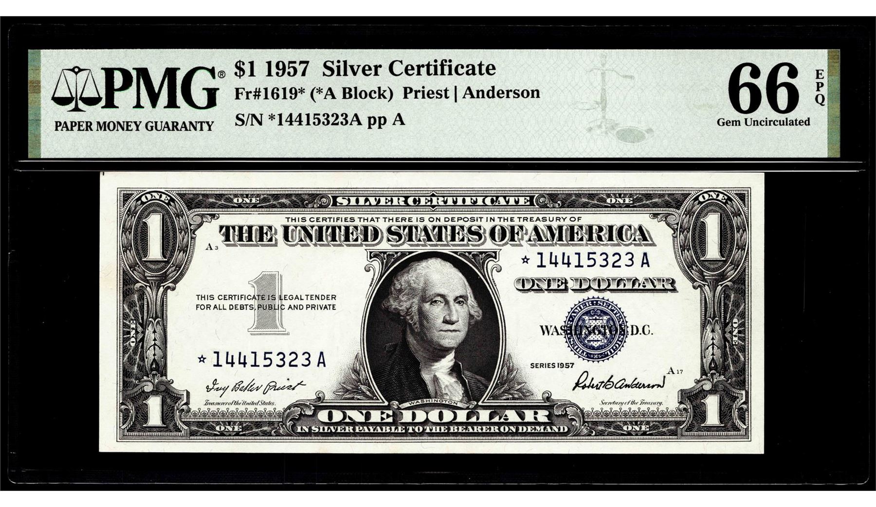 One 1957 $1 Silver Certificate Star Note Fr.1619* PMG Gem Uncirculated 66EPQ. PMG Certified.