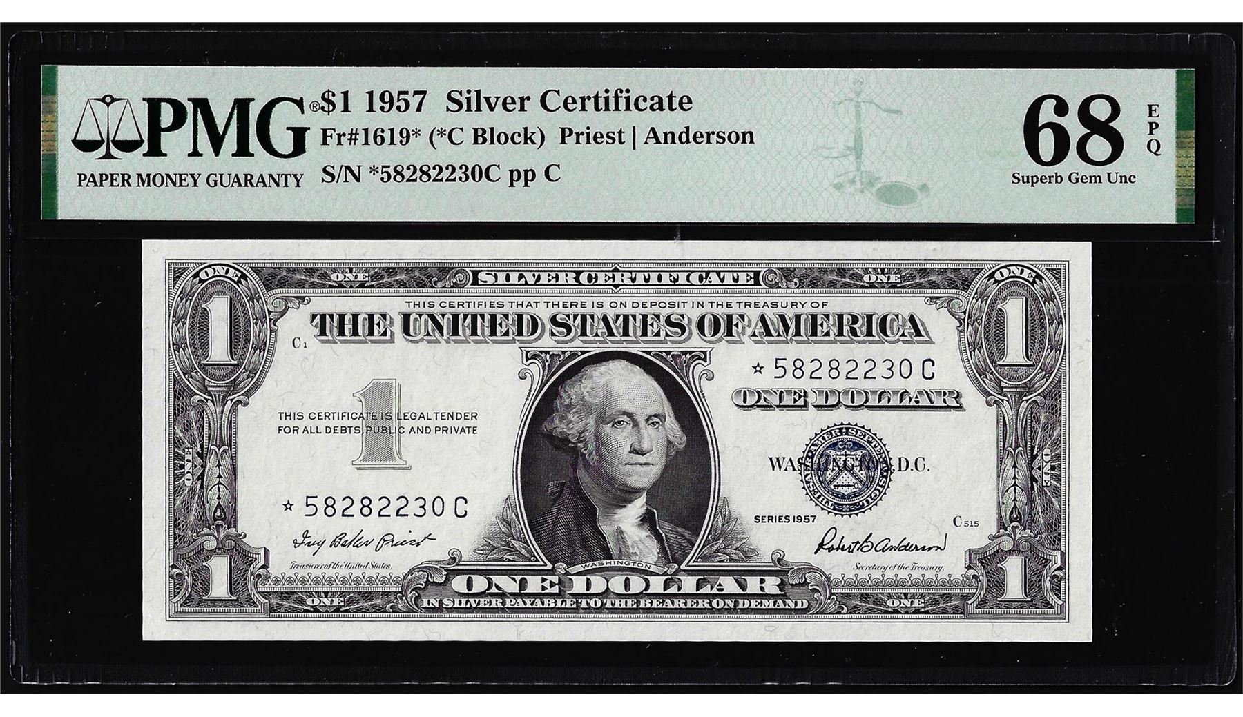 One 1957 $1 Silver Certificate Star Note Fr.1619* PMG Superb Gem Uncirculated 68EPQ. PMG Certified.