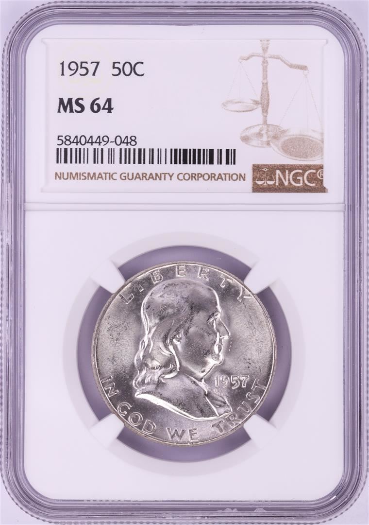 One 1957 Franklin Half Dollar Coin NGC MS64. NGC Certified.