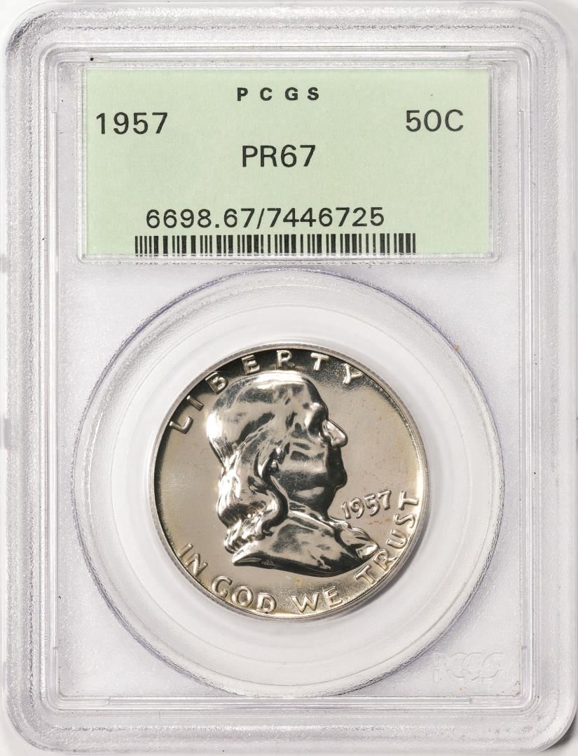 One 1957 Proof Franklin Half Dollar Coin PCGS PR67 Old Green Label. PCGS Graded.