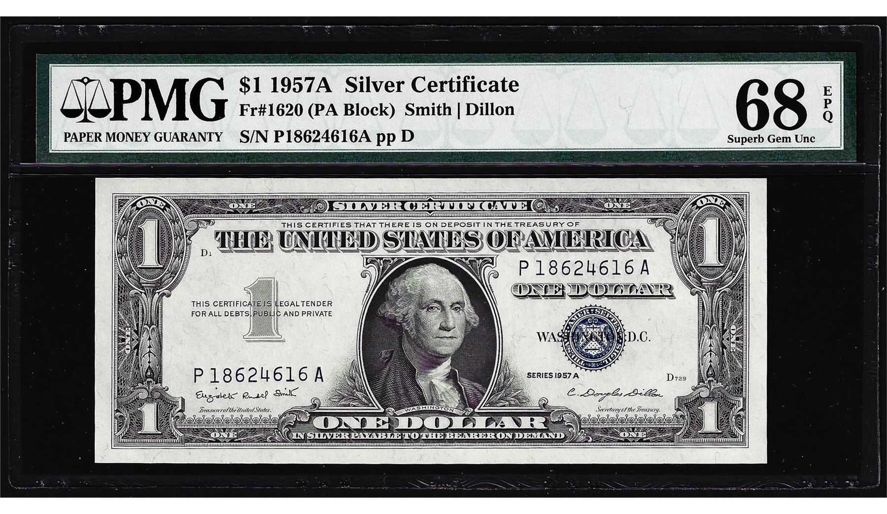 One 1957A $1 Silver Certificate Note Fr.1620 PMG Superb Gem Uncirculated 68EPQ. PMG Certified.