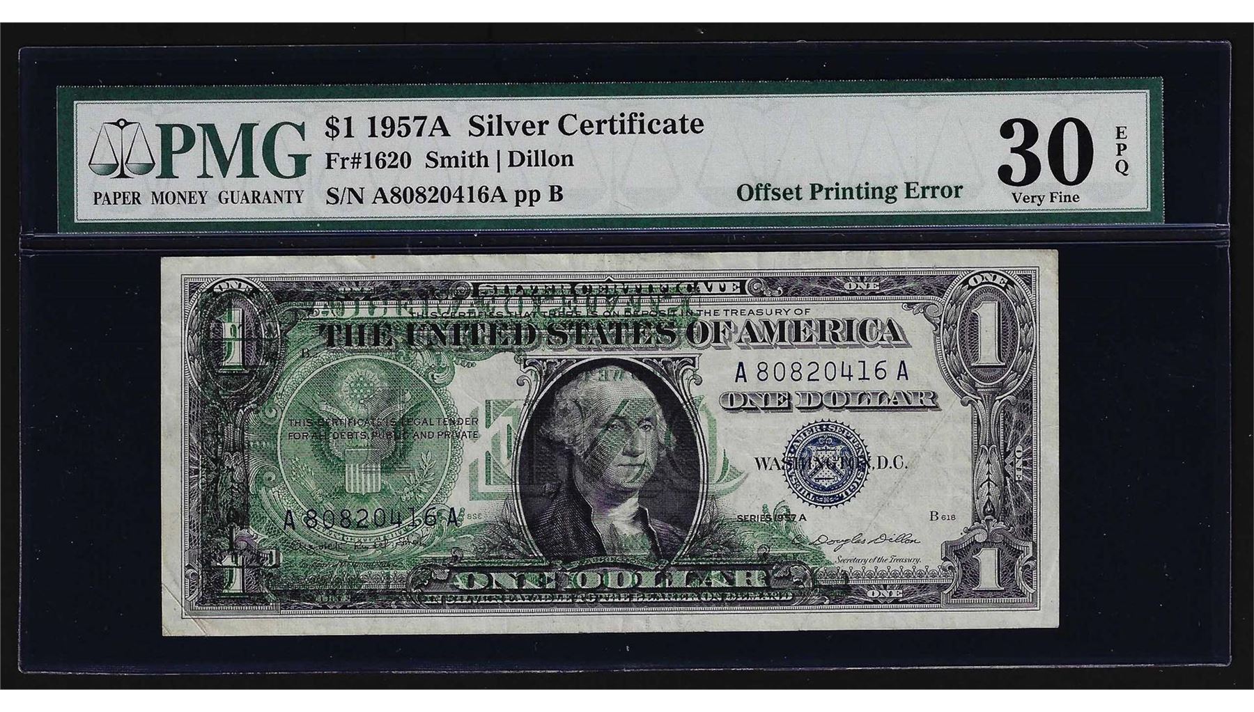 One 1957A $1 Silver Certificate Note Offset Printing ERROR PMG Very Fine 30EPQ. PMG Certified.