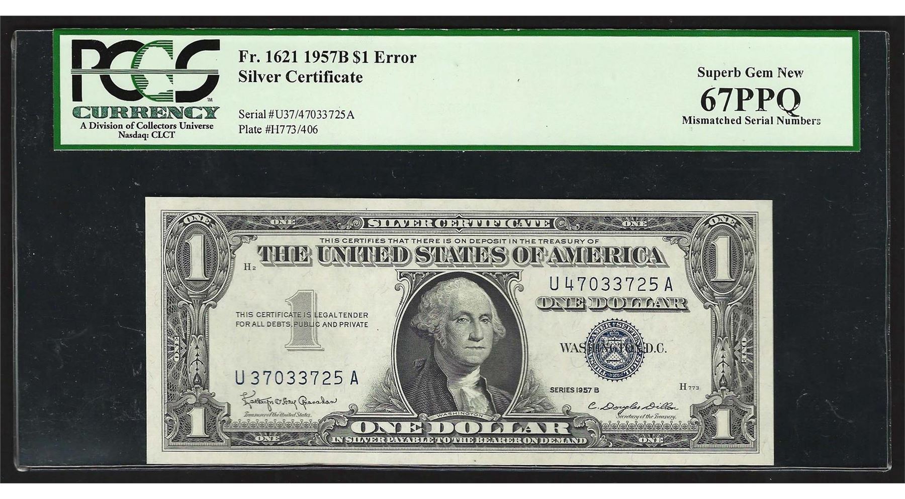 1957B $1 FRN Note ERROR Mismatching Serial Numbers PCGS Superb Gem New 67PPQ