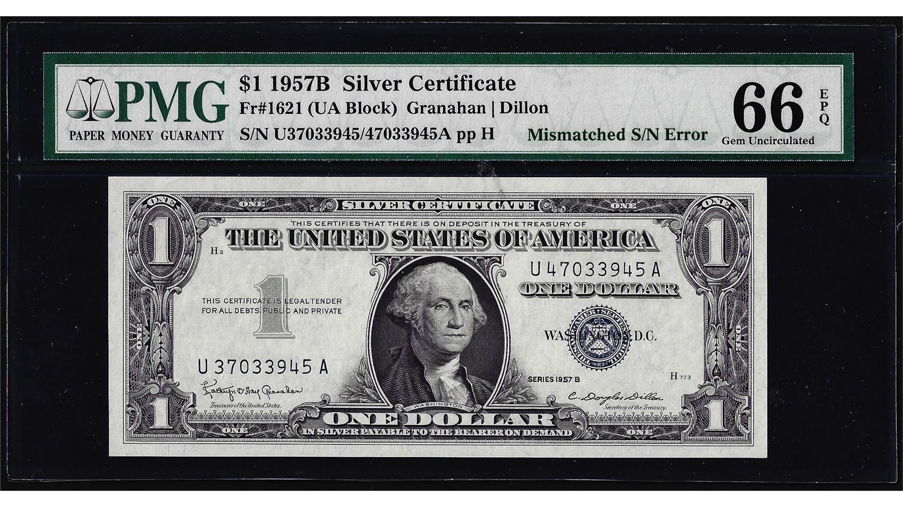 1957B $1 Silver Certificate Note Mismatch Serial Number PMG Gem Uncirculated 66EPQ