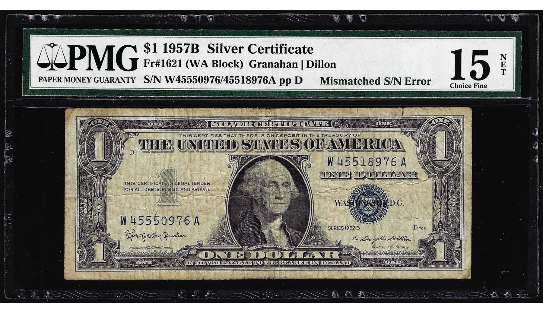 One 1957B $1 Silver Certificate Note Mismatched Serial Number Error PMG Choice Fine 15 Net. PMG Certified.