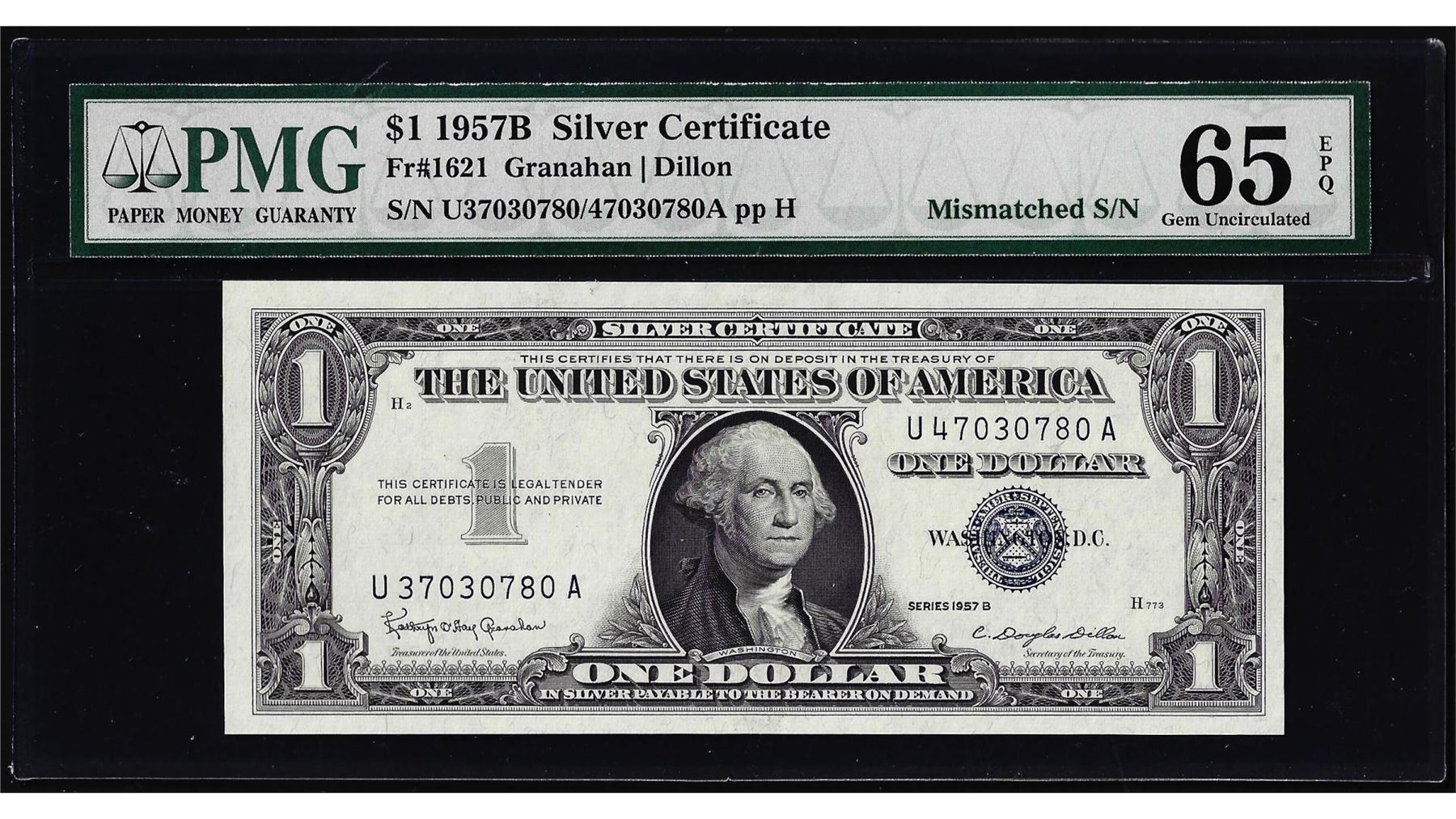 One 1957B $1 Silver Certificate Note Mismatched Serial Number Error PMG Gem Unc. 65EPQ. PMG Certified.