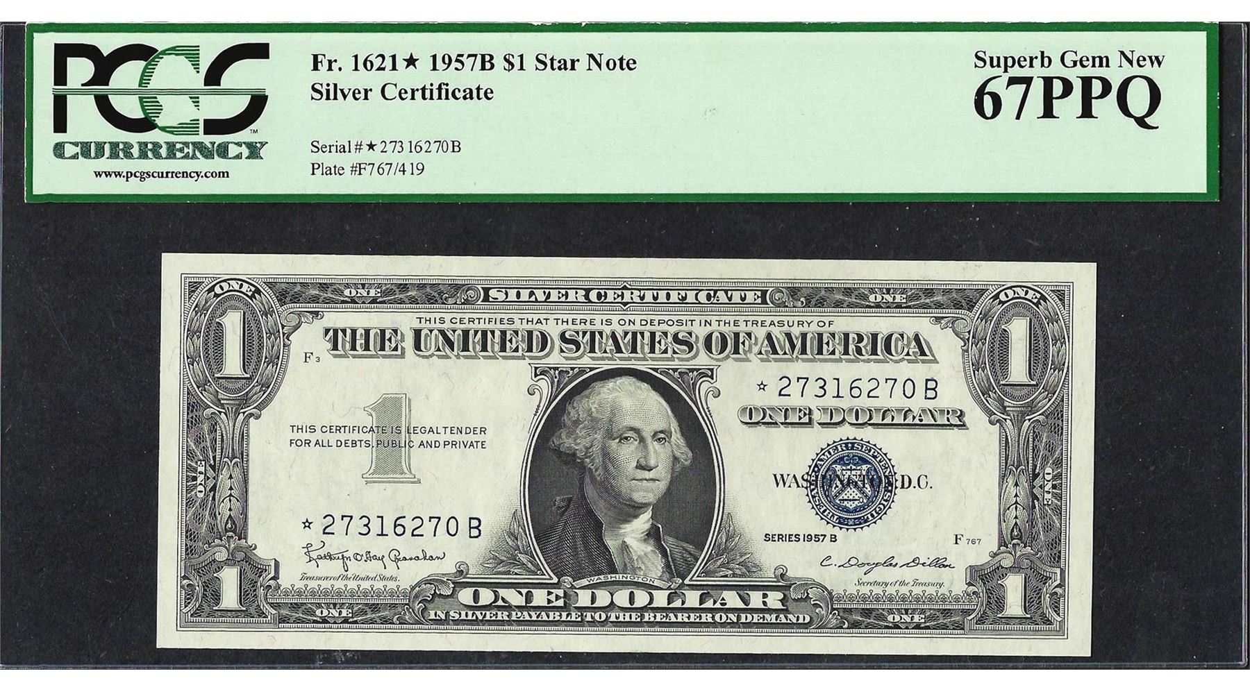 One 1957B $1 Silver Certificate STAR Note Fr.1621* PCGS Superb Gem New 67PPQ. PCGS Graded.