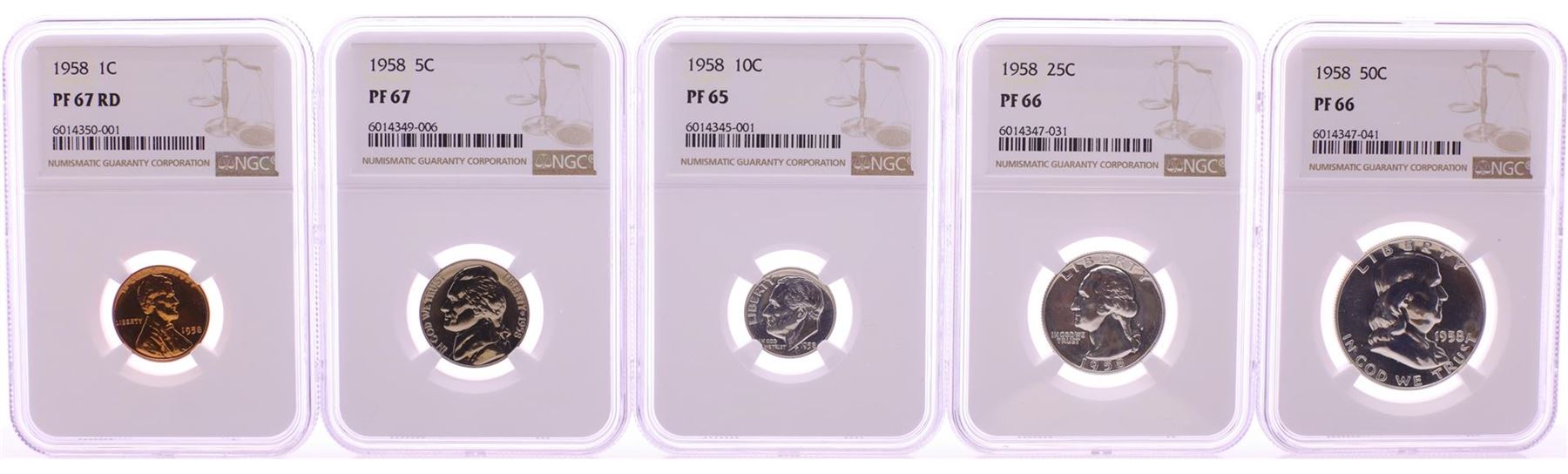 One 1958 (5) Coin Proof Set Graded NGC PF65/66/67. NGC Certified.