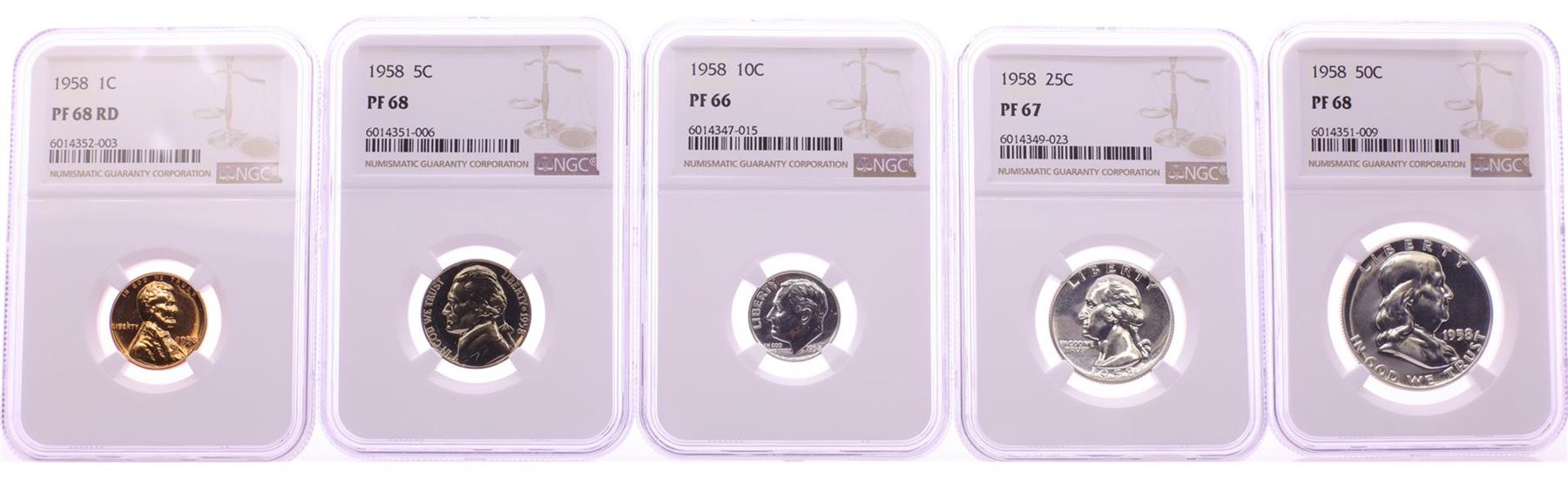 One 1958 (5) Coin Proof Set Graded NGC PF66/67/68. NGC Certified.