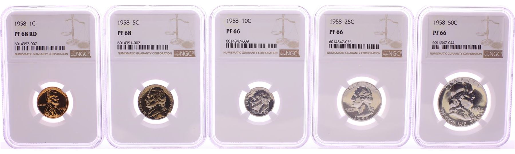 One 1958 (5) Coin Proof Set Graded NGC PF66/68. NGC Certified.
